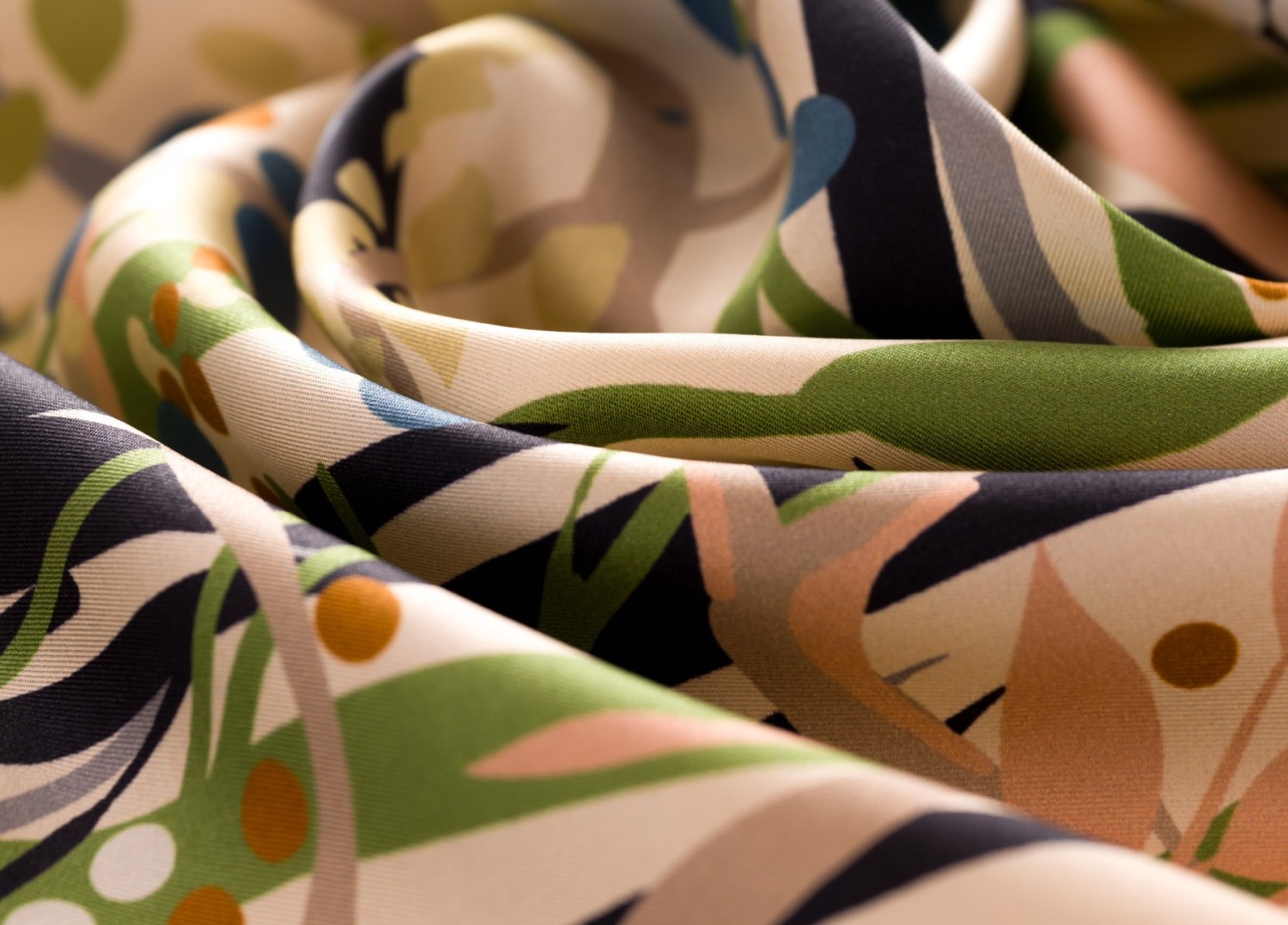 O eșarfă din mătase naturală are o strălucire discretă, nu luciu ieftin, și o textură ușor neregulată la atingere.